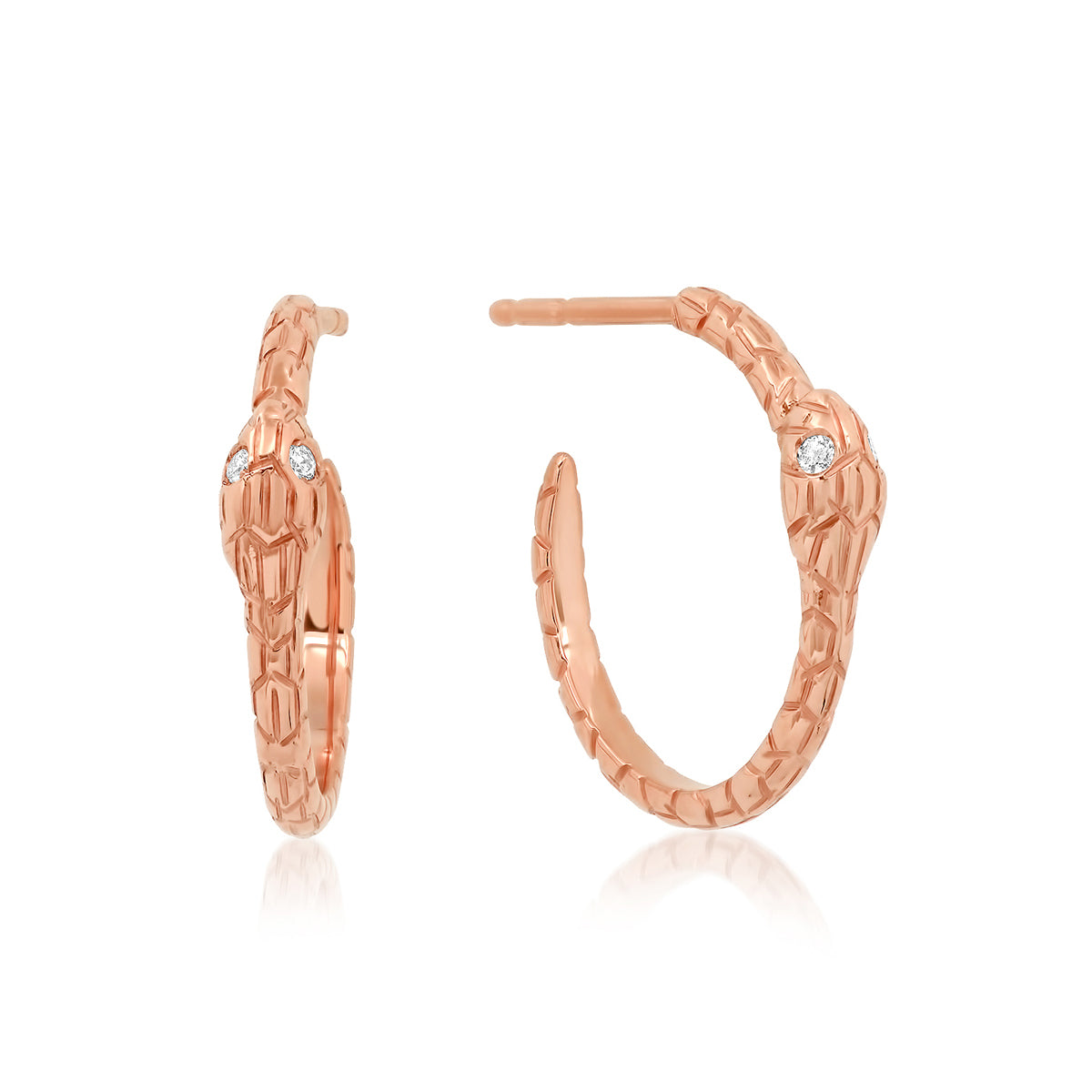 14k gold hoops with etched snakeskin pattern and 2 diamond eyes. Each earring measures 1/2" diameter. Sold as a pair.