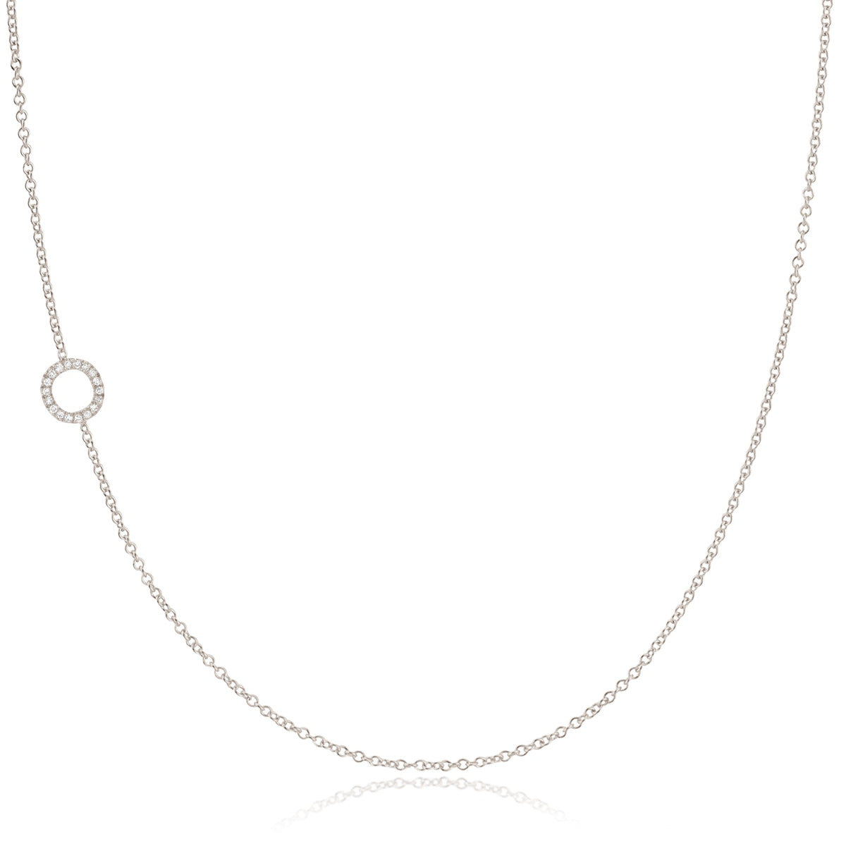Close-up of a woman's neck wearing a rose gold necklace with a letter O charm.