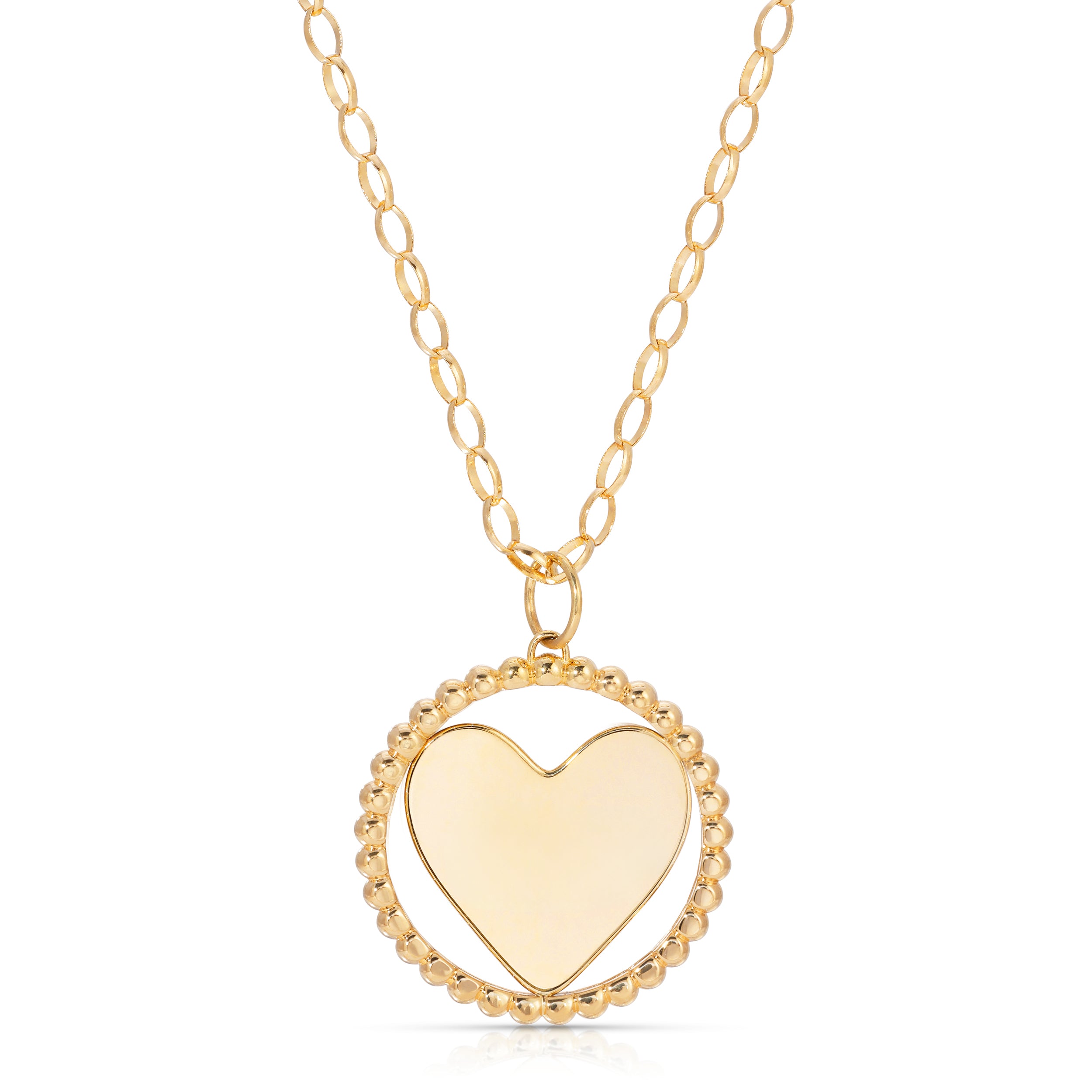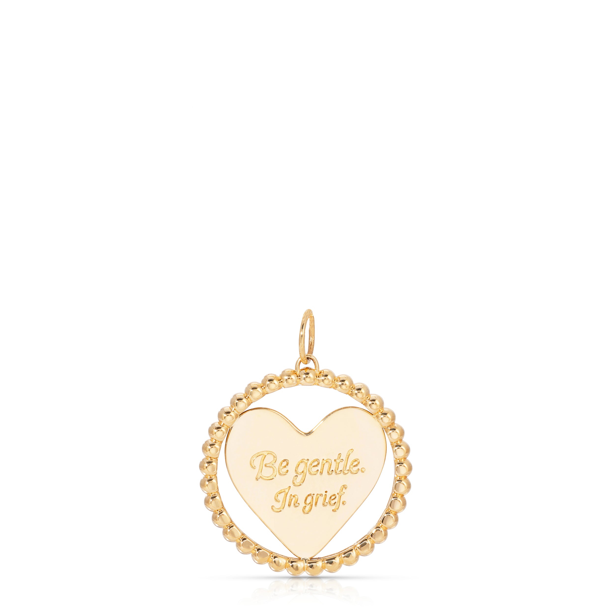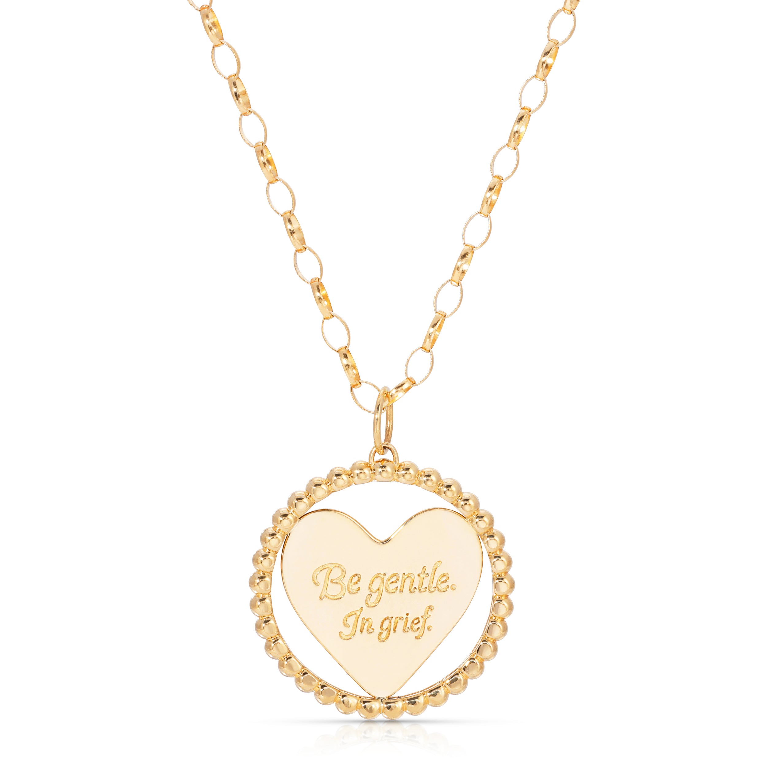 Crafted in collaboration with Kelly McKee Zajfen, this timeless pendant—a heart encircled by a beaded ring represents the community that surrounds, protects and comforts the heart. One side bears the words "Be gentle. In grief.", while the other provides space to engrave the name of your cherished one. Designed with the hope that it allows the gentle space your heart needs on this journey of grieving. Available as a pendant or on an oval rolo chain, and offered in solid 14k gold or sterling silver.