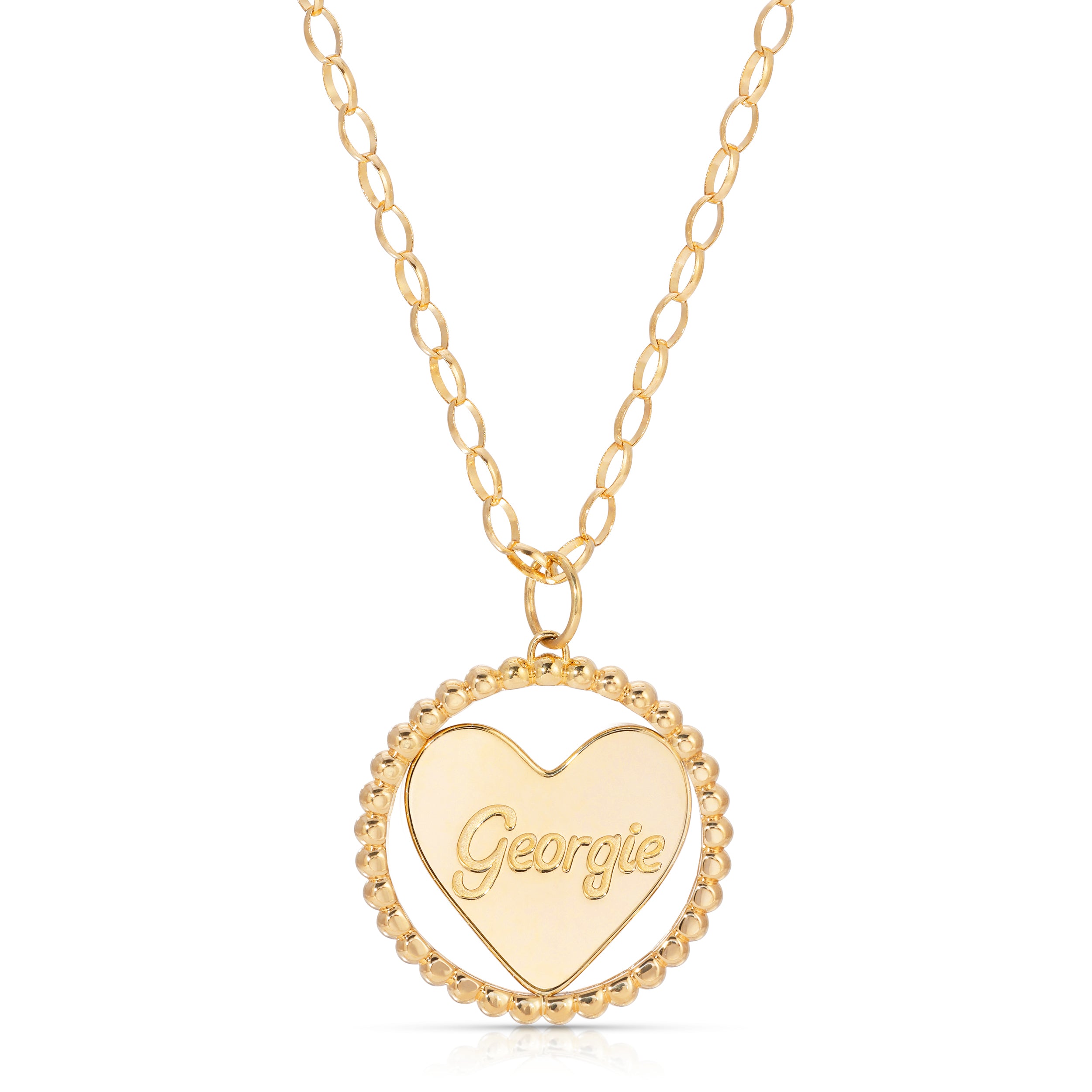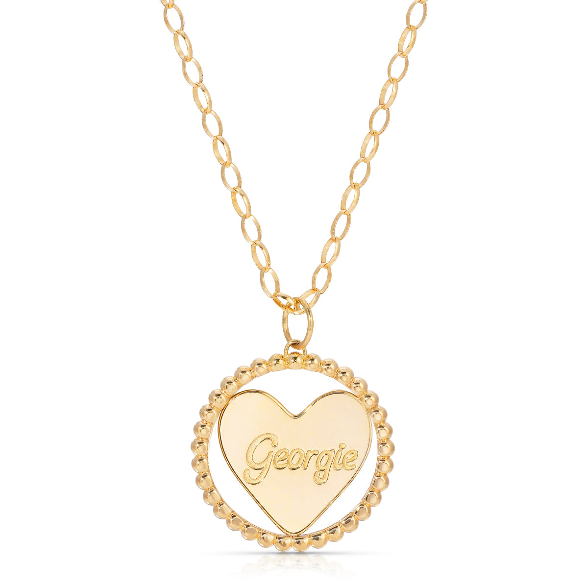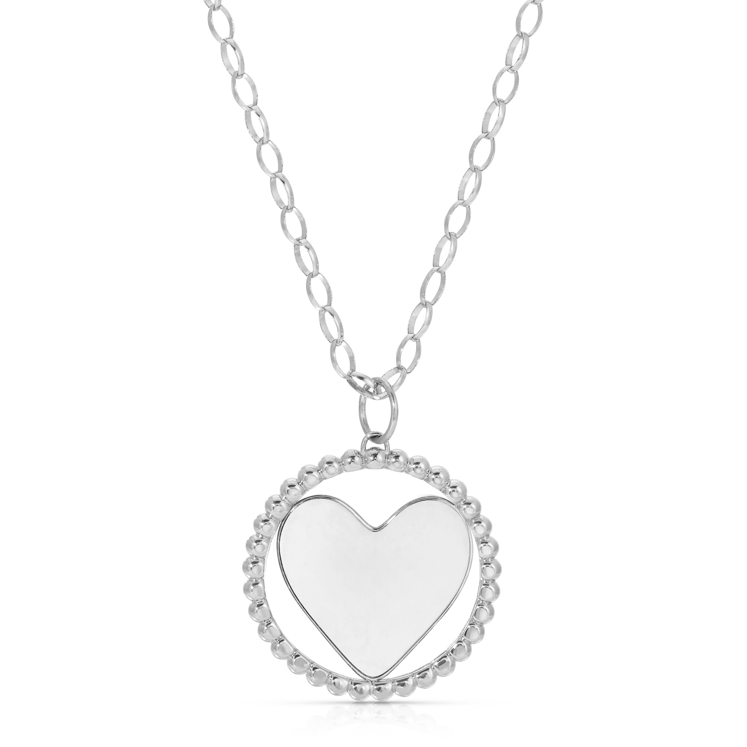 Crafted in collaboration with Kelly McKee Zajfen, this timeless pendant—a heart encircled by a beaded ring represents the community that surrounds, protects and comforts the heart. One side bears the words "Be gentle. In grief.", while the other provides space to engrave the name of your cherished one. Designed with the hope that it allows the gentle space your heart needs on this journey of grieving. Available as a pendant or on an oval rolo chain, and offered in solid 14k gold or sterling silver.