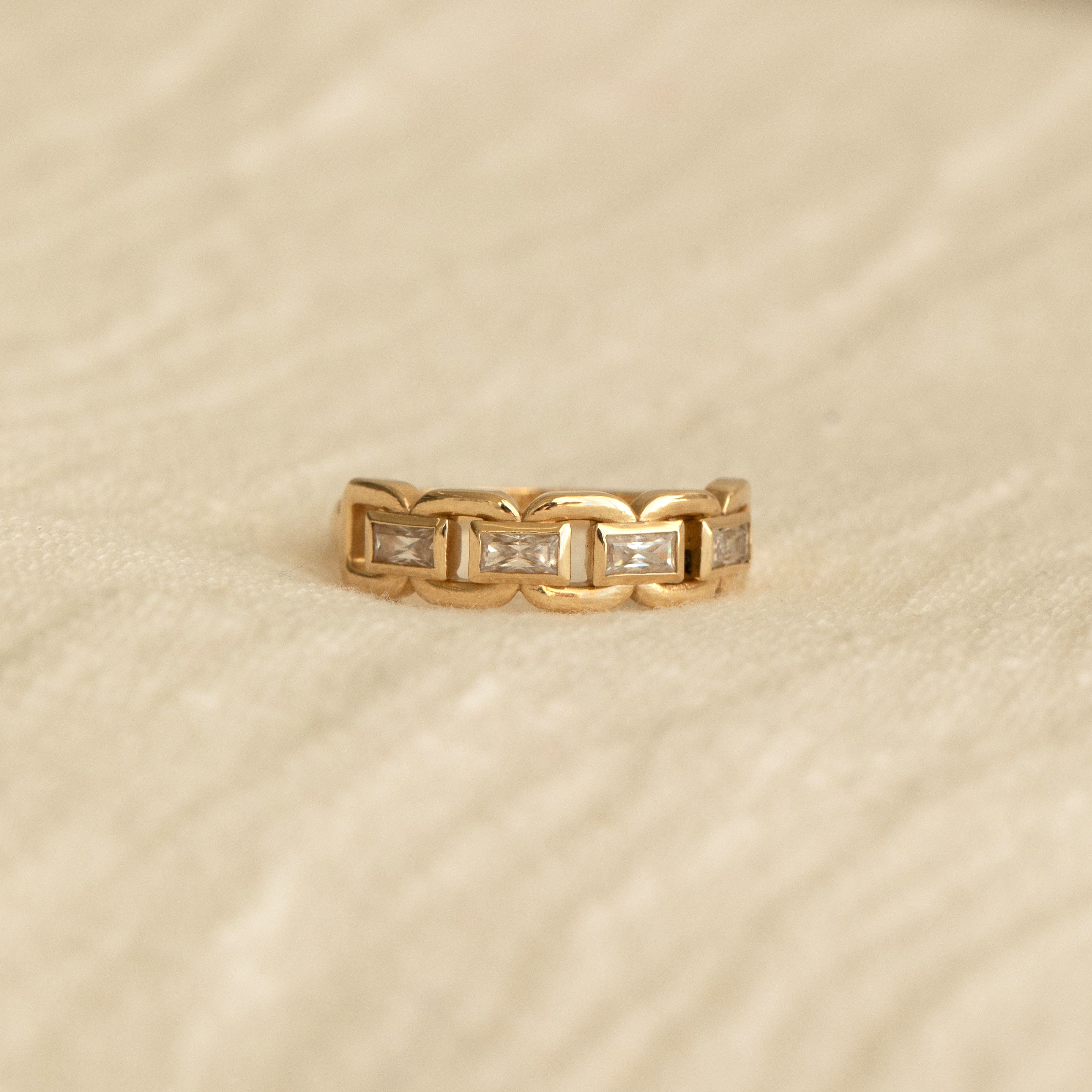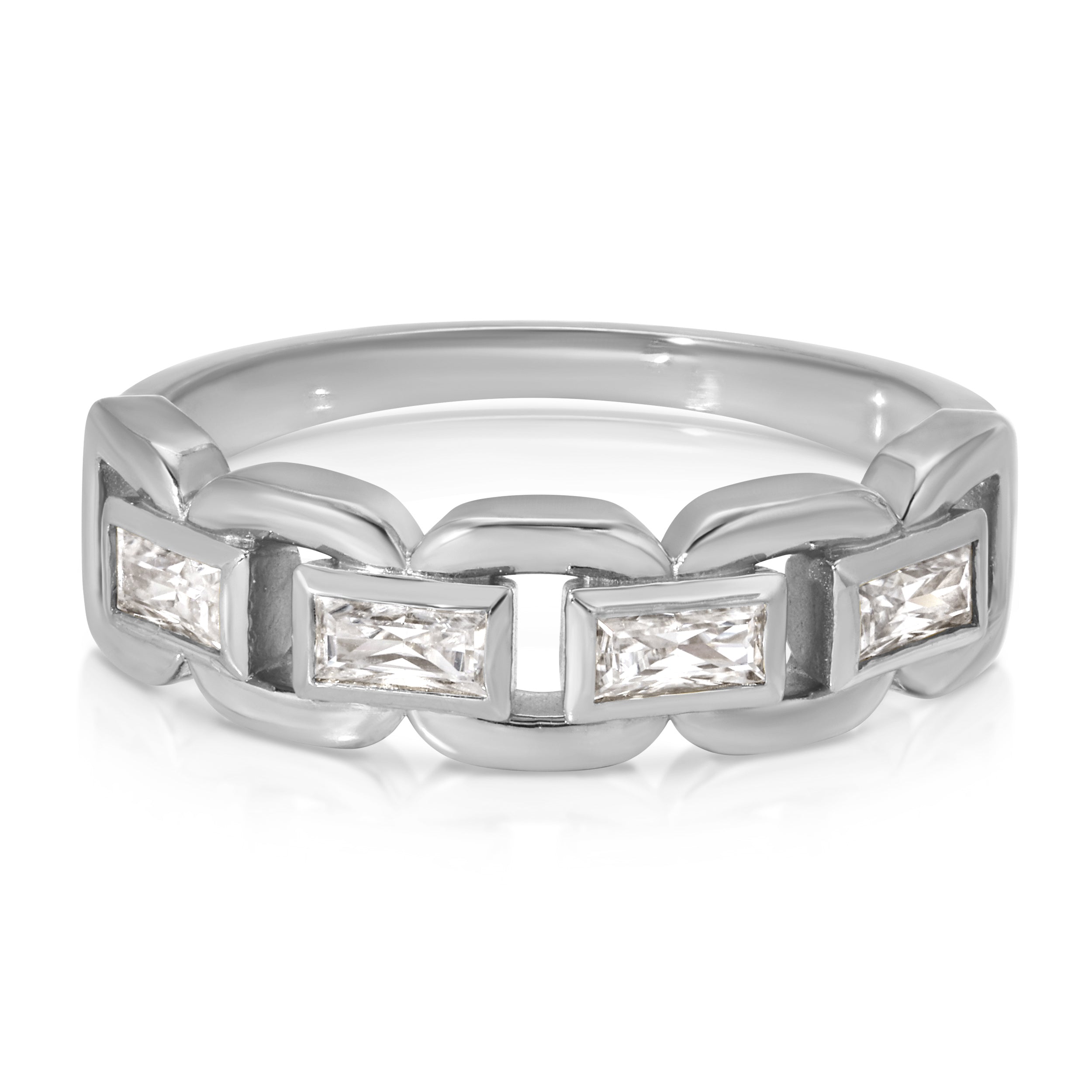Made with 14k gold and featuring four sparkling baguette-cut moissanite stones, our C'est Moi Link Ring gives you that diamond-like sparkle without the hefty price tag. It's perfect for every day, from casual outings to special events. This ring's timeless charm ensures it will be a forever favorite.