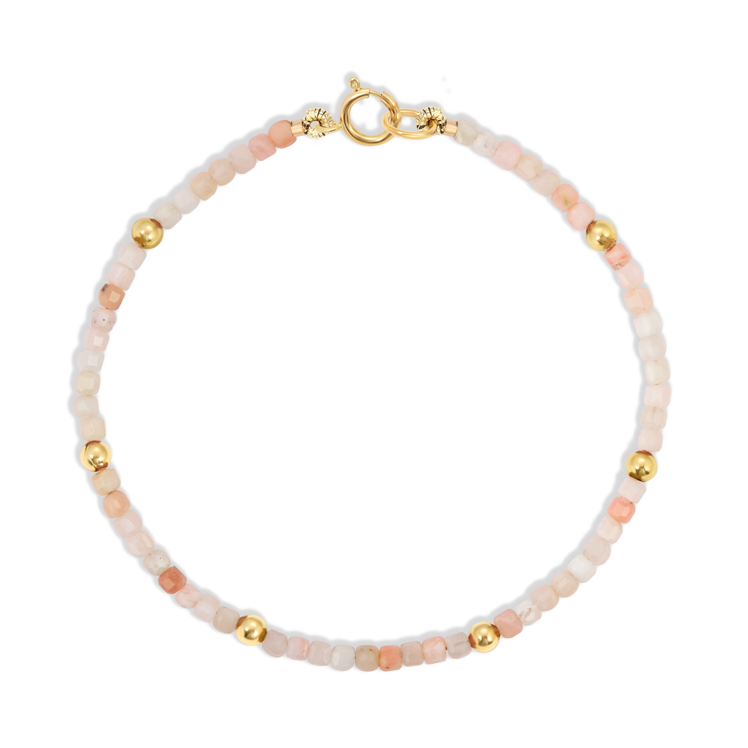 Take a stroll on soft pink sands with the Pink Sands Bracelet! Featuring Peruvian opal in soft white to subtle pink tones, paired with gold fill beads, it's a whimsical twist on classic style, perfect for a carefree look. Each piece is handmade in sunny Los Angeles, adding a touch of California cool to your look. One-of-a-kind with natural bead variations, these bracelets also come with a removable 2-inch extender, ensuring the perfect fit.