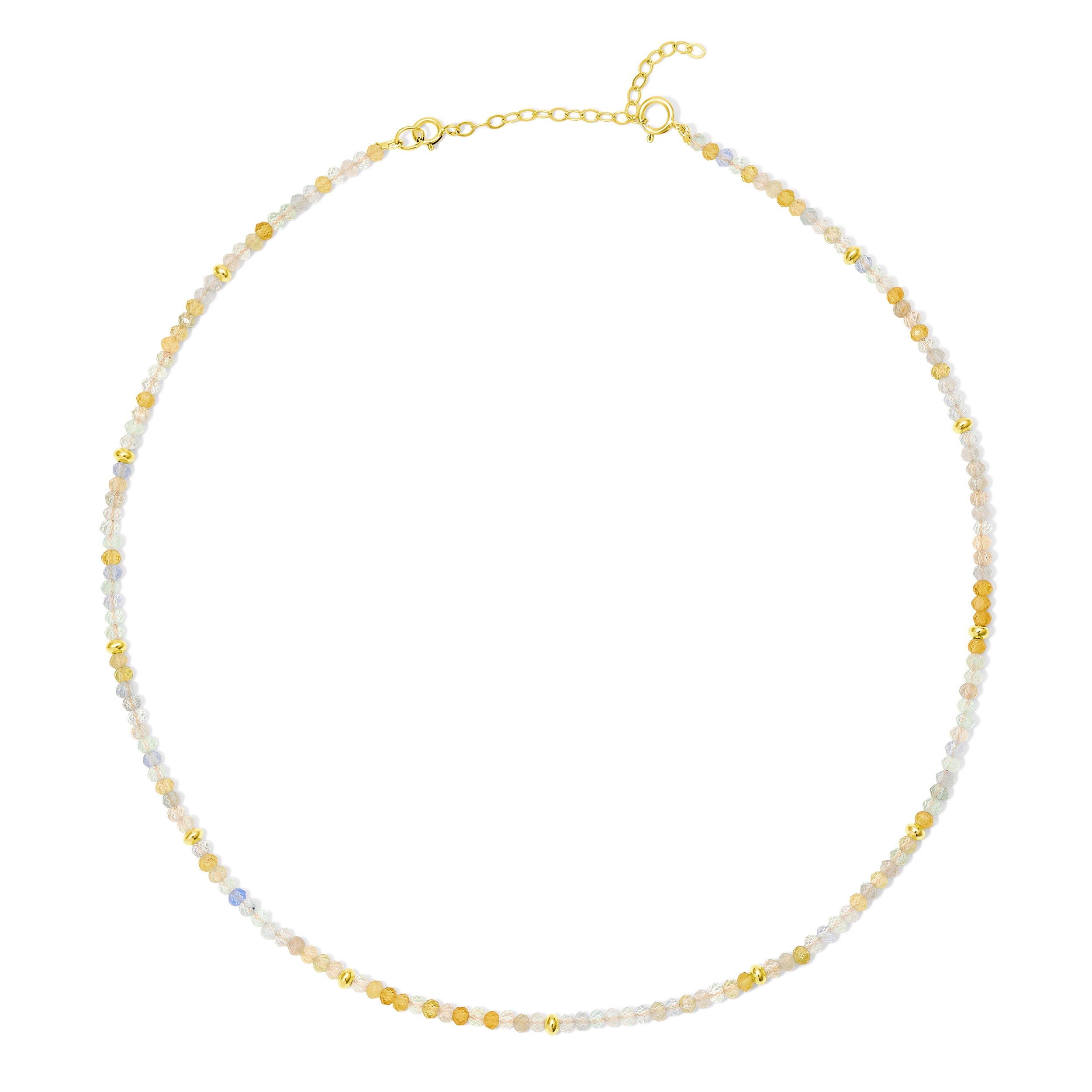 • 3mm faceted blue, green, yellow, and pink aquamarine stones intermixed with gold-fill beads