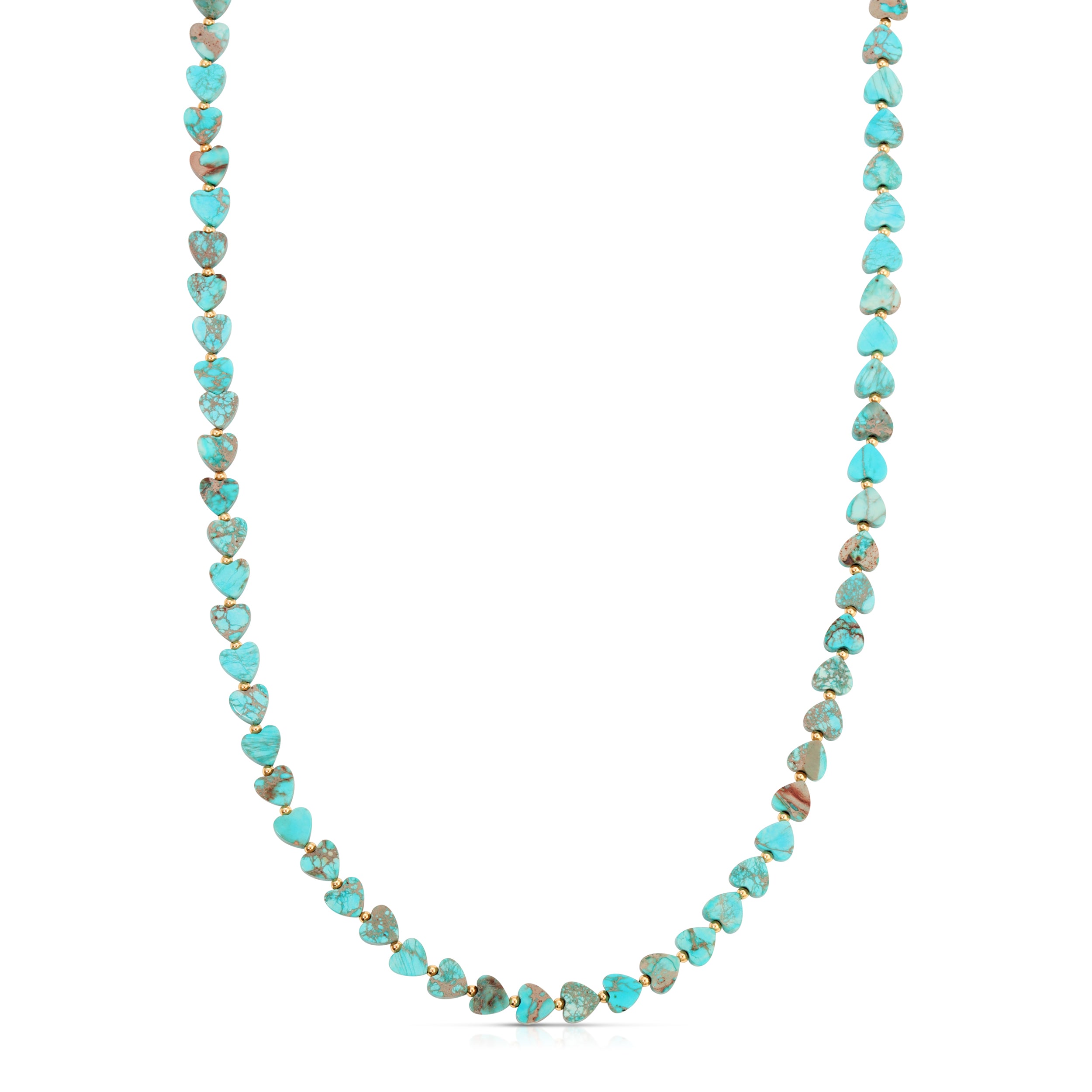 Get ready to beach it up with the Sea + Sky necklace! With aqua terra turquoise heart shaped stones and gold fill beads, this necklace is like a sunny day by the shore, all wrapped up in a cute accessory. Each piece is handmade in sunny Los Angeles, adding a touch of California cool to your look. One-of-a-kind with natural bead variations, these necklaces also come with a removable 2-inch extender, letting you style them your way.