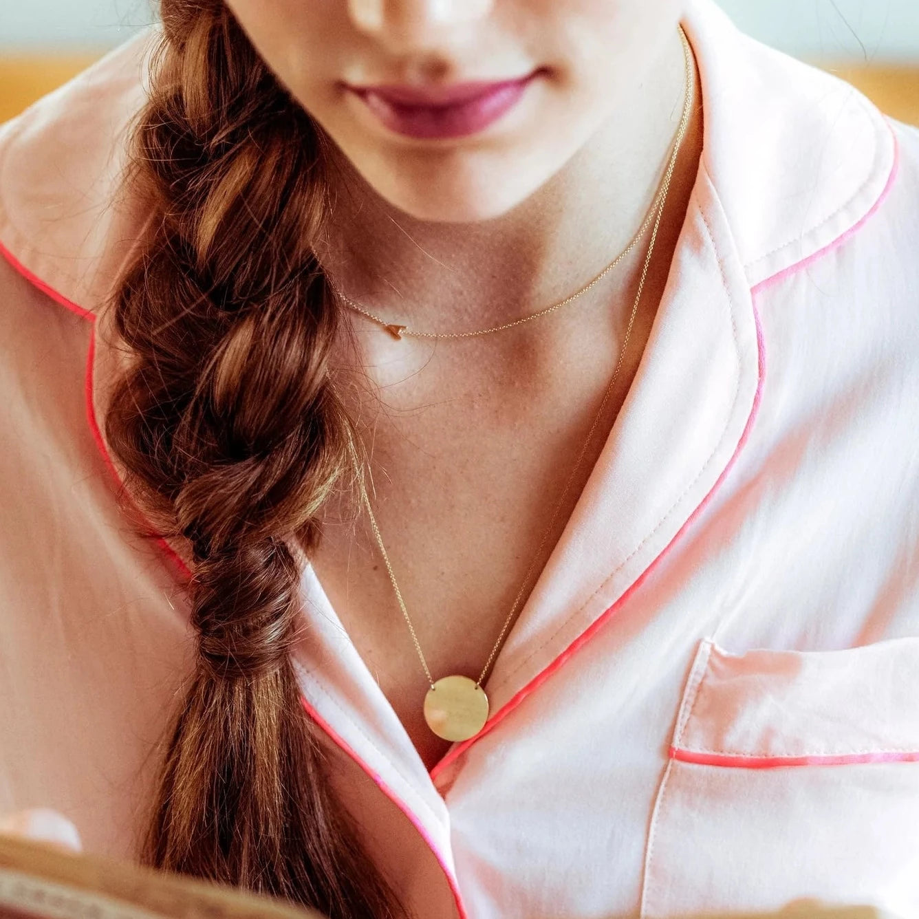 The Geometric Circle Necklace features a circular pendant suspended from a delicate cable chain, a harmonious blend of modern design and timeless elegance.