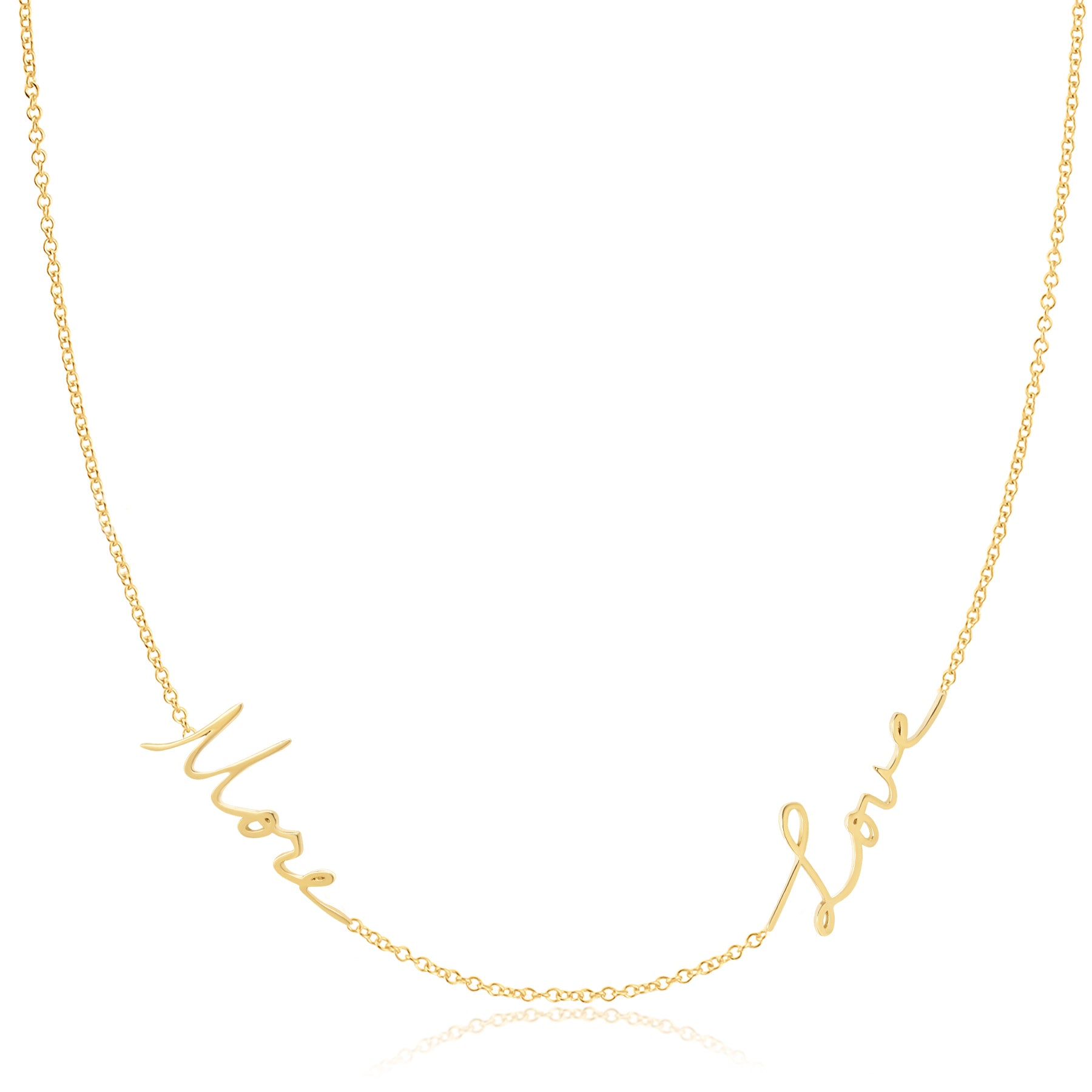 The More Love Necklace is made from solid 14k yellow gold. Each word measures approximately 3/4" and is attached to a delicate 16-18" adjustable chain.