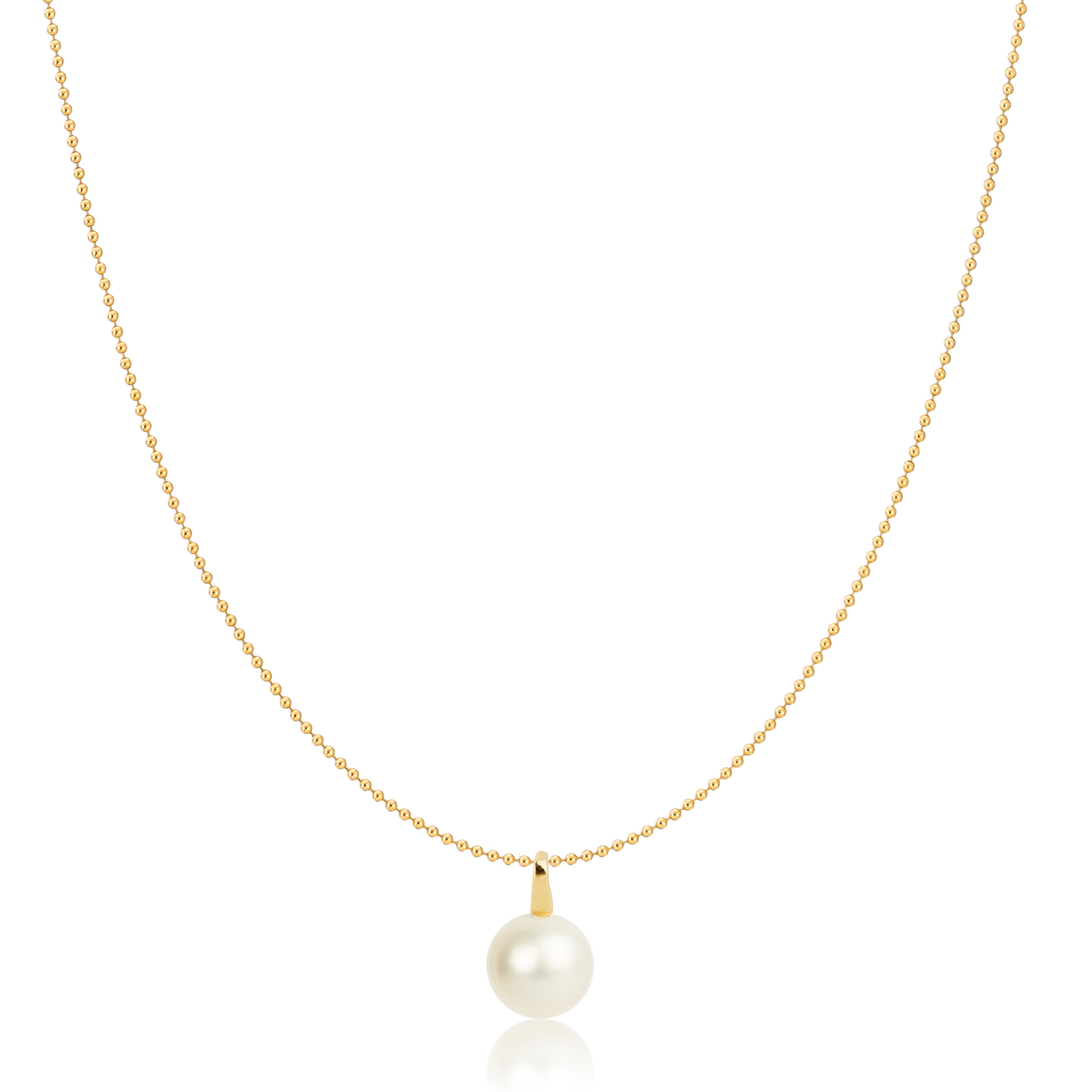 Our Perla Necklace is a white pearl that ranges from 9 to 10 mm with a handmade 14K yellow gold bail strung on a 22" 14K yellow gold bead chain.