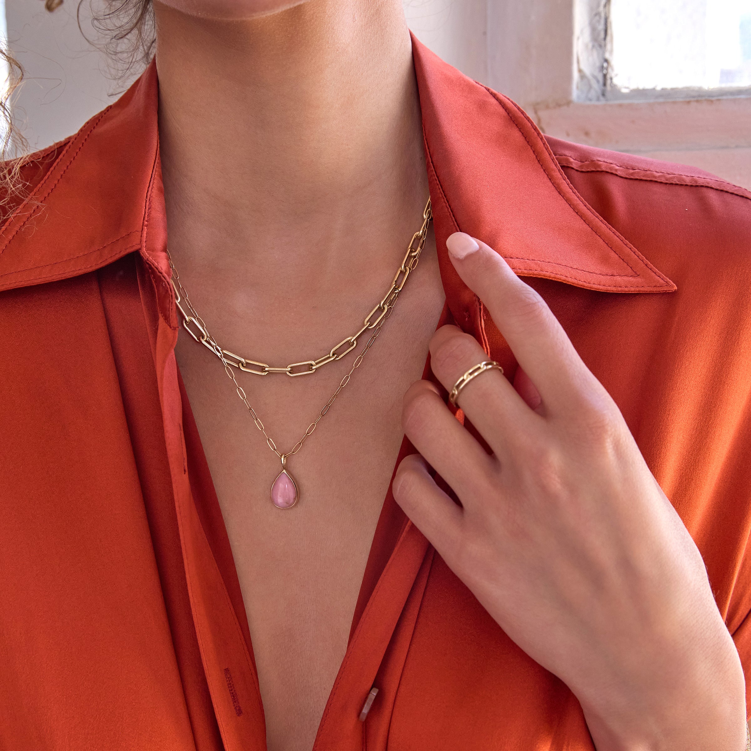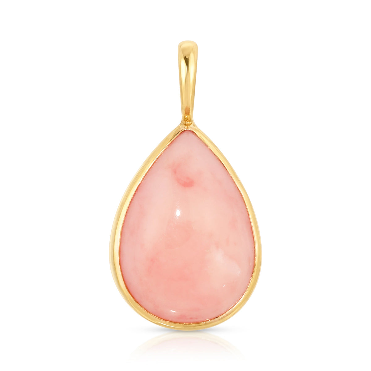This charm features a rare pink cabochon opal, cut into a beautiful teardrop shape, and held in place by a 14k yellow gold bezel. Due to the distinct characteristics of pink opals, this charm's size and color may differ, but on average, it will measure around 20 x 11 mm.
