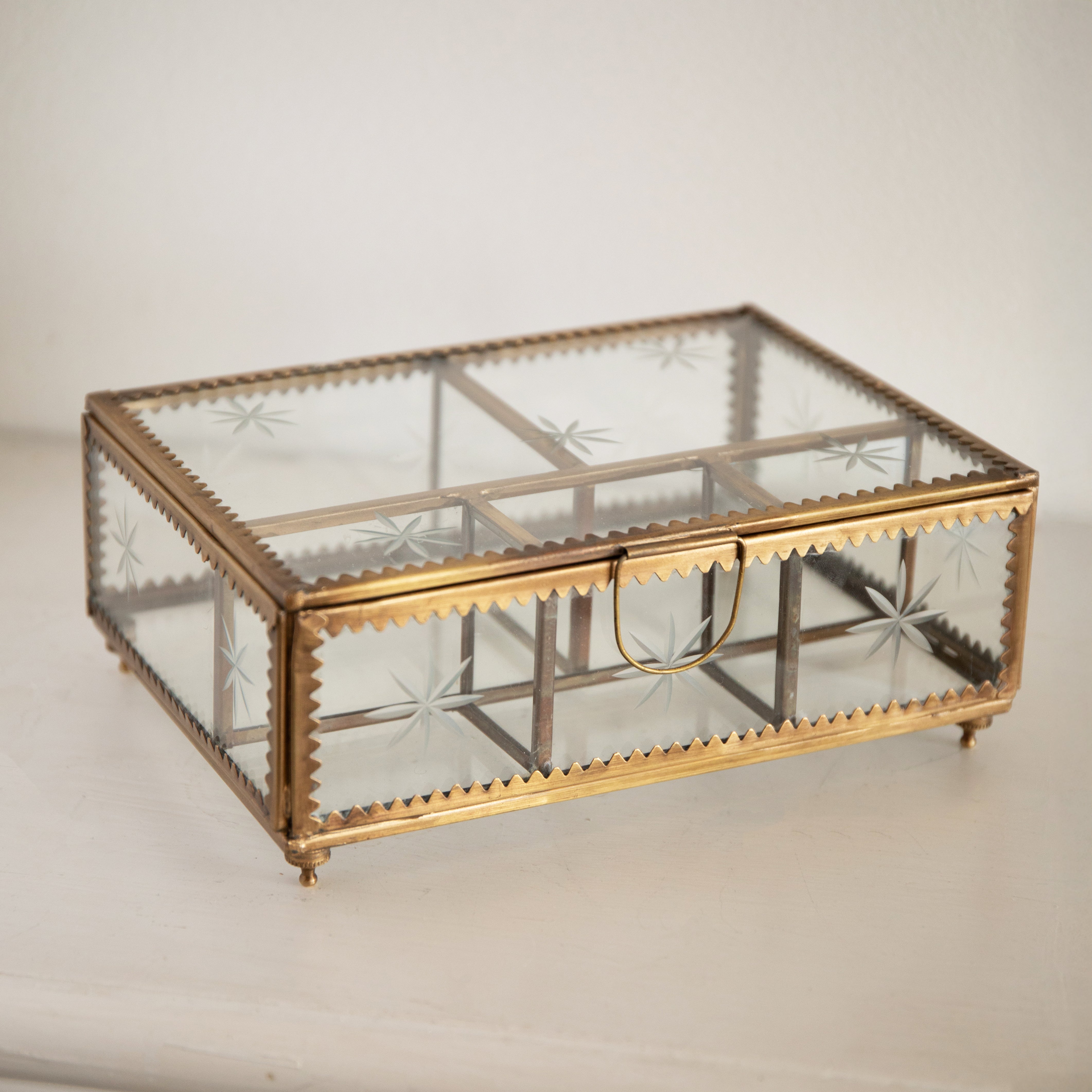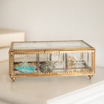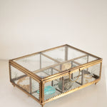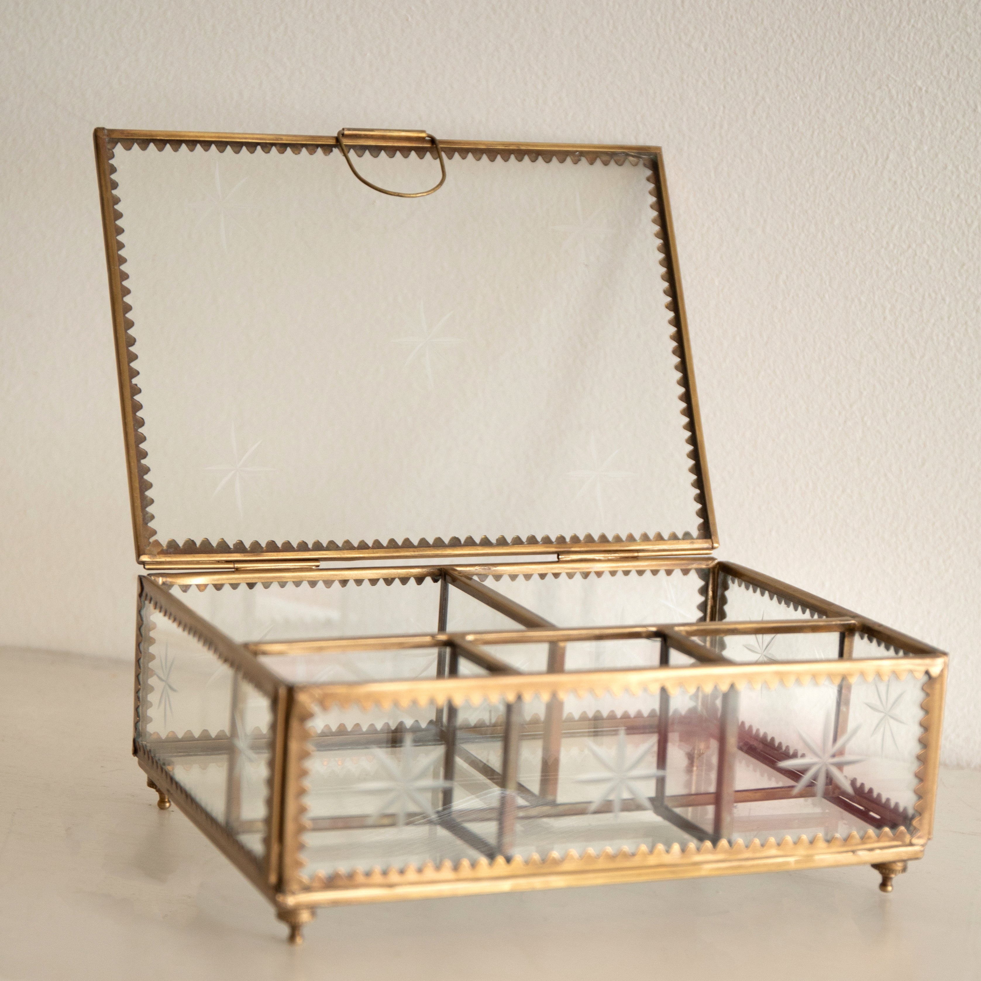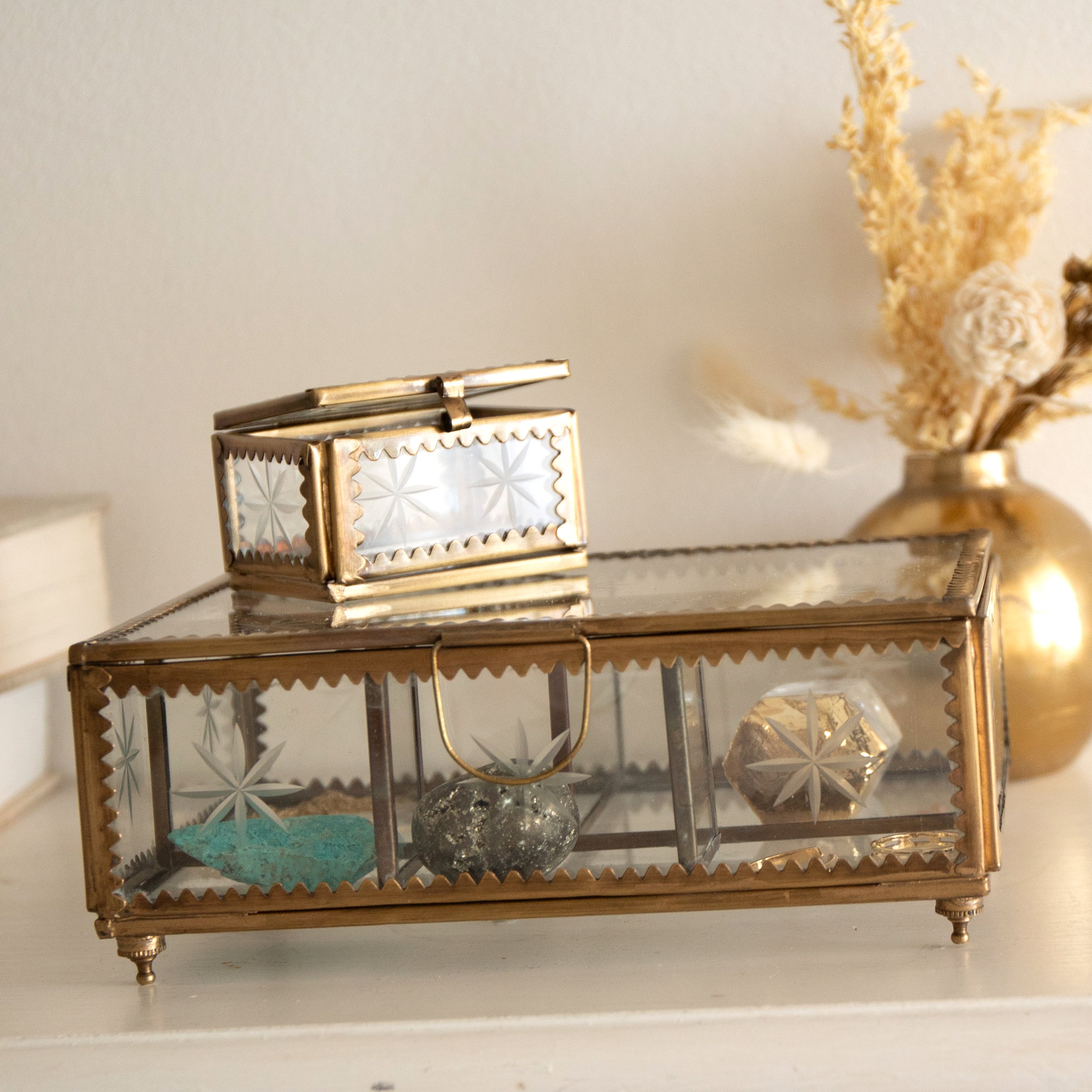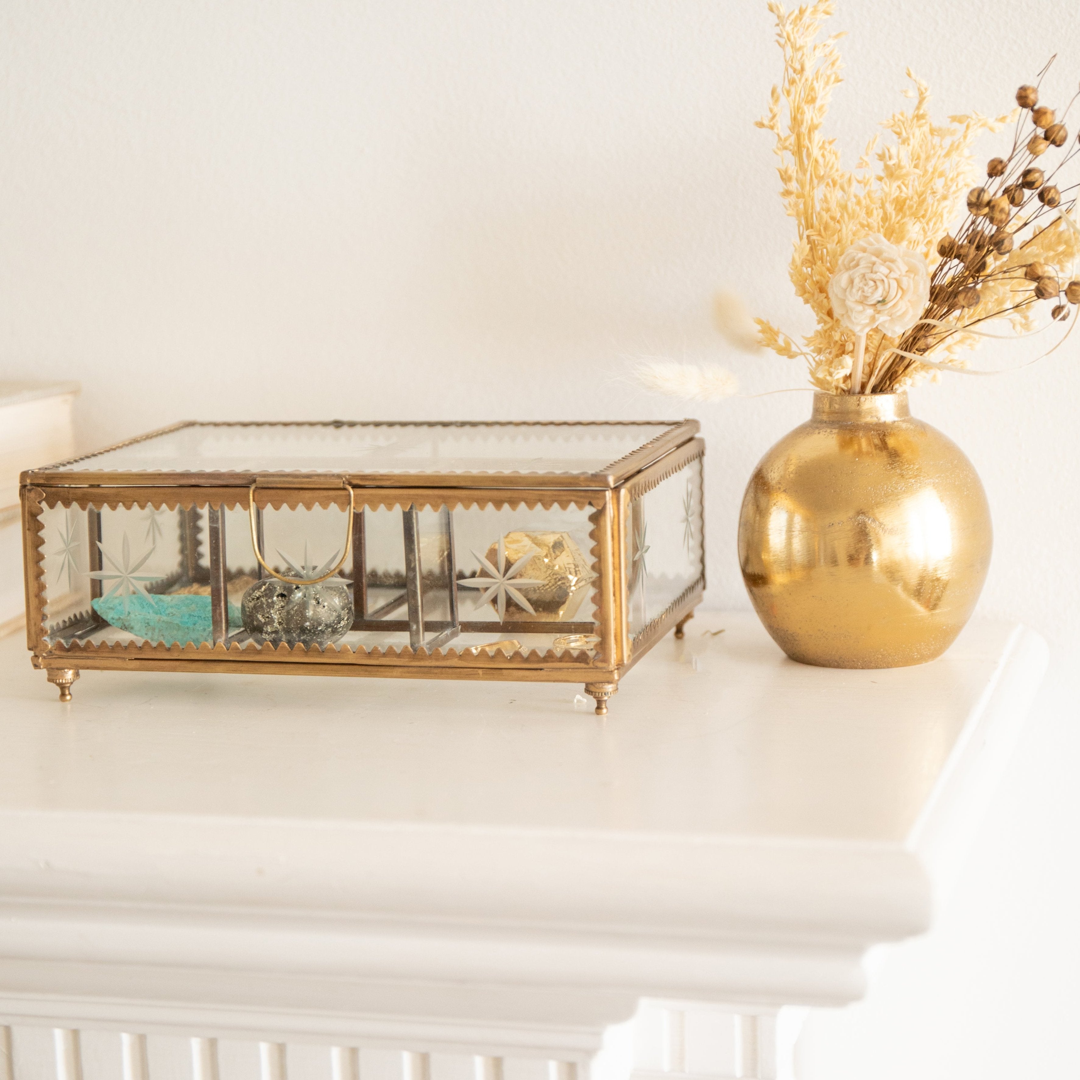 Ideal for storing jewelry, keepsakes, or small treasures, this case features sleek glass panels framed by refined gold edges, offering a luxurious and timeless look. Inspired by the golden accents that bring warmth and beauty into my own home, this piece seamlessly blends function and style, making it the perfect addition to any space. Keep your treasures safe and beautifully displayed with this sophisticated trinket case.