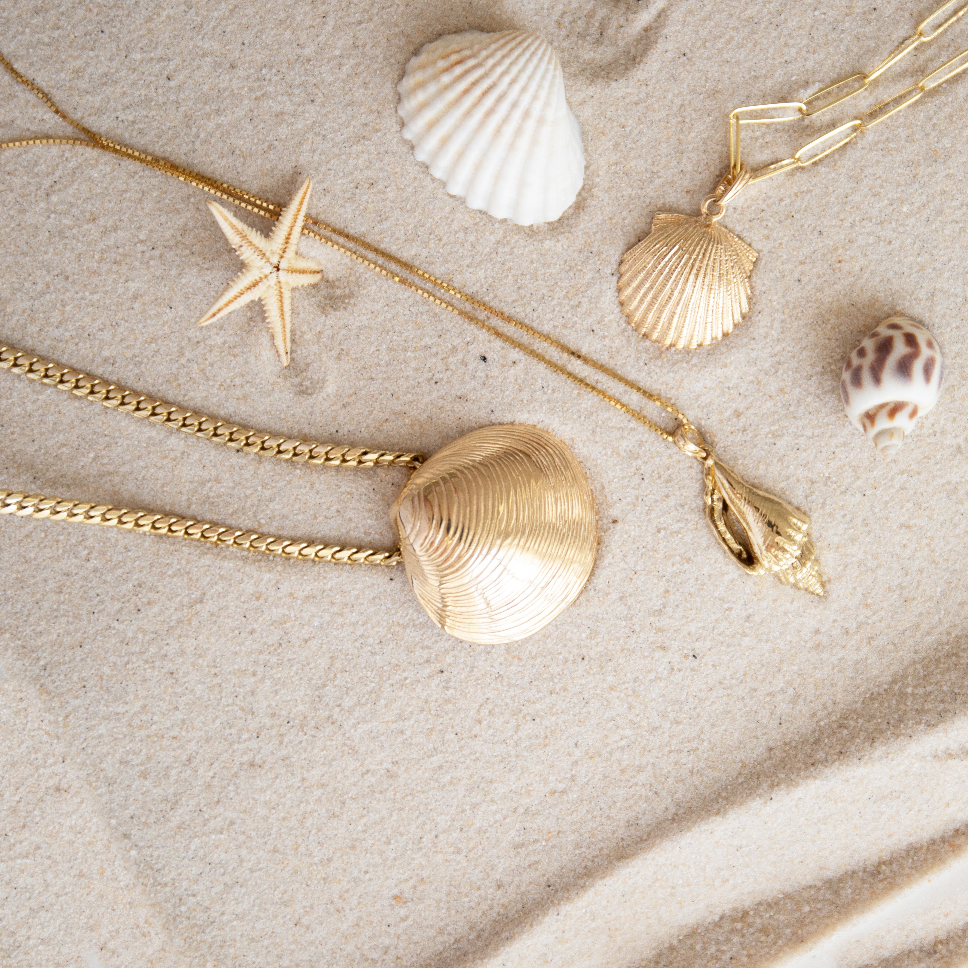 Maya's Inspiration: Whenever I escape to the beach, one of my favorite pastimes is hunting for seashells along the shore. If you follow my adventures on Instagram, you've likely seen me displaying some of my favorite finds and already know that I get tons of inspiration from shells or what I call the “jewels of the ocean". This collection of golden pendants represent that special moment of discovering the beauty of nature's creations; making it such special piece to wear all summer long and beyond!